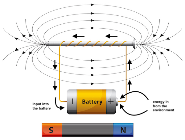 The reverse of electromagnetic induction is an electromagnet. In this case, we have the empty well of a battery creating an energy displacement. When a circuit is complete, energy flows from the environment INTO the battery instead of, as in electromagnetic induction, from the tips of the wires towards the mechanical displacement caused by the motion of the magnets. Here there are no magnets, so a coil of wire is wrapped around a piece of neutral ferrous metal to replicate a magnet. The spiral wrapping of wire around the metal creates a coil. A magnetic vortex is induced as the energy flows in from the environment towards the displacement end of the battery. Just as a magnet used to induce current is metal, the current flows in the wire coil wrapped around the metal (to amplify), magnetizing the metal. Not unlike the flow of water flowing down a drain, the energy flow moves towards the origin of displacement, in this case, one end of the battery. The current induces a spiraling magnetic vortex in the direction of the flow through the wires towards the energy displacement receptacle. This movement of energy propagates a magnetic field surrounding the ferrous metal turning it into an electromagnet. When energy moves, the magnetic field is induced. When the flow stops, the magnet field dissipates. As the battery fills with energy from the environment, the input flow of energy slows and eventually stops. We call this state a dead battery.