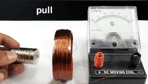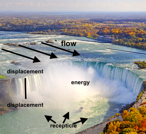 When an electric current is induced, the flow of energy is caused by the displacement of a magnetic push or pull. When you push a magnet though a coil of enamel coated copper wire, direct current will enter one open end of the wire to fill the void caused by the magnetic displacement. Subsequently, when you pull the magnet, energy will enter through the other end of the wire, to again, fill the displacement. The force of the movement determines the reactive volume of energy. For example if you slowly place the magnet between the coil like gently placing your finger into a tub of water, there is very little displacement caused and little to no wave is generated. If you however, thrust your finger into the water with more force, waves caused by the displacement are then generated. This exemplifies the fluid dynamic nature of energy flow or flux.