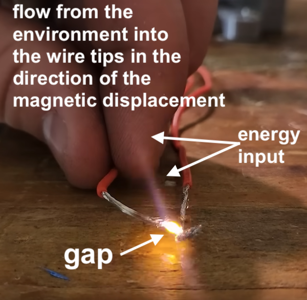 When magnets move, they create a displacement of energy in a copper wire coil. If you move the two ends of the wire coil close enough together to create a gap, the spark you see is NOT an electrical discharge, it is an electrical CHARGE flowing from the environment INTO the exposed copper wire tip ends. This flux input is an energy flow TOWARDS the magnetic displacement. Energy from the environment is flowing into the tips of the wires in an attempt to equalize the displacement caused by the magnetic push/pull. The tips become the zero-point entry of energy input from the environment. The term vacuum is a good analogy to help visualize what is going on. Imagine the magnet push/pull creating a displacement of air like a diaphram, the copper wires acting like tubes allow the air to flow IN from the environment in the direction of the suction causing a directional flow in an atttempt to equalize the displaced air pressure.