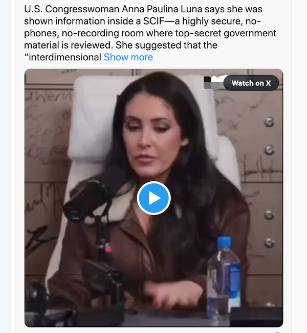 So, my wife is in my office yelling at me about my 88 year old mother (who lives in her own apartment) who I am taking care of. Seemingly this is a deep rooted issue. Something along the lines of - there is a demon inside of my mom (for the record it's actually an Archon) and she is a parasite or tick who has embedded herself deep into my soul and is sucking the life out of me. Could be however, seems my mother has taken up way more mental real estate in my wifes head than with me. Anyway, it would seem obvious the root source of life threatening stress in my life might not actually be my mother. Anyway, I saw this recent post - a clearly deep and independent thinking congressional government "force" - Anna Paulina Luna. The name says it all. When I saw that picture, the very first thought that popped into my head was - Hey isn't that Katy Perry? So I asked my wife - Is Anna Paulina Luna REALLY Katy Perry? She ignored me and warned not to change the subject while she continued on with her barrage of belligerent insults, attacks and indignation. But hey, I think I just might be on to something here...
