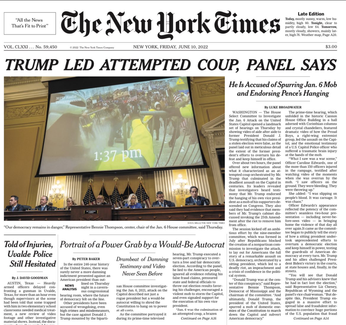 House Select Committee chairman calls Jan. 6th attack an 'attempted coup' LA Times Front Page - Jan 6 was Attempted Coup NY Times Front Page - Trump led Attempted Coup WAPO Front Page - Panel pins Blame on Trump Boston Globe Front Page - Jan 6 Evidence Tells the Story Capitol Police report indicates January 6 security failures happened under Pelosi's supervision Mobs of far-left rioters tried to storm the White House. They were repelled by police, who were assaulted and hit with projectiles. Democrats condemned law enforcement for stopping the rioters HRC: Jan 6 was "criminal conspiracy" Dr. Charles Morgan on Psycho-Neurobiology and War, How to operate a human via remote control Ex-Google CEO Eric Schmidt’s New Investment Firm Deepens His Ties to the U.S. Military Biden says 'Putin's tax on both food and gas' is to blame  for record-high inflation Biden threatens oil companies, blaming  them for the sky-high gas prices because they want to continue making "more money than God this year [GOLFCLAP] Biden: The insurrection on January 6 is one of the darkest chapters in our nation‘s history Biden talks about getting angry enough to attack political leaders Biden admin paying Taliban-controlled airline to help Afghans flee the country Obama: "Ordinary men and women are too small minded to govern their own affairs…" Obama: "We have to take steps to detoxify our discourse, particularly the scourge of 'disinformation, conspiracy theories, and hate' online Ex-Mossad head launches new firm to win the influence war Justin Bieber struck by facial paralysis Tampon Shortage Top Pelosi Staffer Registered As ‘Foreign Agent’ to Lobby For Chinese State Media Outlet Authorities Refuse Request to Release Bodycam Footage of Paul Pelosi DUI Arrest Wickr, Amazon’s encrypted chat app, has a child sex abuse problem Racine man gets 40 months in prison for arson of store during Kenosha protests Pentagon to build prototype of mobile nuclear reactor that will demonstrate utility of portable alternate energy source to support military operations in austere locations Scientists covered a robot finger in living human skin NASA’s new powerful space Webb  telescope gets hit by larger than expected micrometeoroid High Gas Prices Are About to Cause Another Public Safety Crisis Rising rents, gas and food prices push U.S. inflation to 40-year high of 8.6%, CPI shows Was Jan. 6 Organized by the FBI? [FLASHBACK] Kicking out GOP poll watchers in Philadelphia to count over 600,000 ballots in secret Supreme Court permits counting of Pennsylvania mail ballots with missing dates 32 Arrested for Child Exploitation in Kansas Undercover Operation Former altar boy who was sexually abused by a Victorian priest has been awarded almost $2 million Disney exec who opposed DeSantis' parental rights bill OUSTED Biden’s ‘Disinformation Governance Board’ sought to censor Americans with dissenting views in coordination with Big Tech Mentally ill man arrested in disturbing beating of store worker Shooting: Armed stranger appeared in the middle of a church service Police Kill Intruder Trying to Forcefully Enter Alabama Elementary School 3 dead, 1 hurt after Maryland manufacturing facility shooting It is getting unsafe for armed criminals these days Pentagon divulges number of US-funded biolabs in Ukraine - insists facilities were all about public health and safety Teenage brothers drown in NJ school swimming pool PGA Tour disciplines golfers 'who have decided to turn their backs' on organization to play for LIV Golf Fox News reporting National Guard preparing to be deployed in wake of upcoming abortion ruling by Supreme Court Assange Lawyer sued UK government over illegal surveillance and information sharing - This means Assange case may* be headed toward annulment and dismissal Former owner and Munitions CEO Pleads Guilty to Conspiring to Export United States Defense Articles including to The People’s Republic of China The US Military Is Almost Completely Dependent On China For Key Mineral Used In Ammunition Rand Paul Slams Dems, Media For "Ginning-Up Violent Crazy People" In Wake Of Kavanaugh Assassination Attempt Attempted Murder of Kavanaugh Felony Encouraged by Schumer and White House Schumer: Brett Kavanaugh 'You Will Pay the Price, You Wont Know What Hit You!' Schumer promises quick vote on gun legislation Democrat activists target Kavanaugh childrens school and Amy Coney Barrett church The Democrats’ ‘Insurrection’ Against The Supreme Court Democrats begin fundraising off of Jan. 6 hearing Z in Moscow Sky UK government acquires its first quantum computer Hundreds die as Somalia faces famine